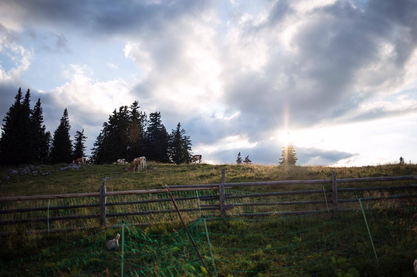 Hui, die Woche verging aber schnell. Während ich hier am Flughafen sitze und am Weg zur nächsten aufregenden Reise bin, möchte ich euch noch von unserem letzten Ausflug erzählen. Vor über eine Woche haben wir zu acht (plus 2 Hunde) eine Wanderung gemacht. Insgesamt waren wir 2 Tage unterwegs. Start war am Samstag um 9 Uhr Richtung Göller. An dem Tag hatte es über 30º und wir kamen nach 2 Stunden am Gipfel an. Nach einer kurzen Pause ging es weiter Richtung kleinen Göller. Nach dem etwas anstrengenden Aufstieg war ich froh, den Kamm entlang zu gehen und die Aussicht genießen zu können. Das wohl schönste Gefühl an diesem Tag war das eiskalt servierte Skiwasser (für die Burschen gab’s Radler) auf der Göller Hütte. Weiter ging der Weg durch Wald und über Weiden zur Hofalm. Dort hatten wir uns für die Nacht Schlafplätze reserviert. Zwischen schwangeren Kühen und glücklichen Schweindln haben wir dann den Tag mit Radler und gutem Essen ausklingen lassen. Ein besonderes Highlight war der Sonnenuntergang, der den Himmel in alle Farben einfärbte. Nach dem 10 km Aufstieg am ersten Tag waren meine Füße doch einigermaßen müde und ich hab mich über das Bett im Matratzenlager sehr gefreut.